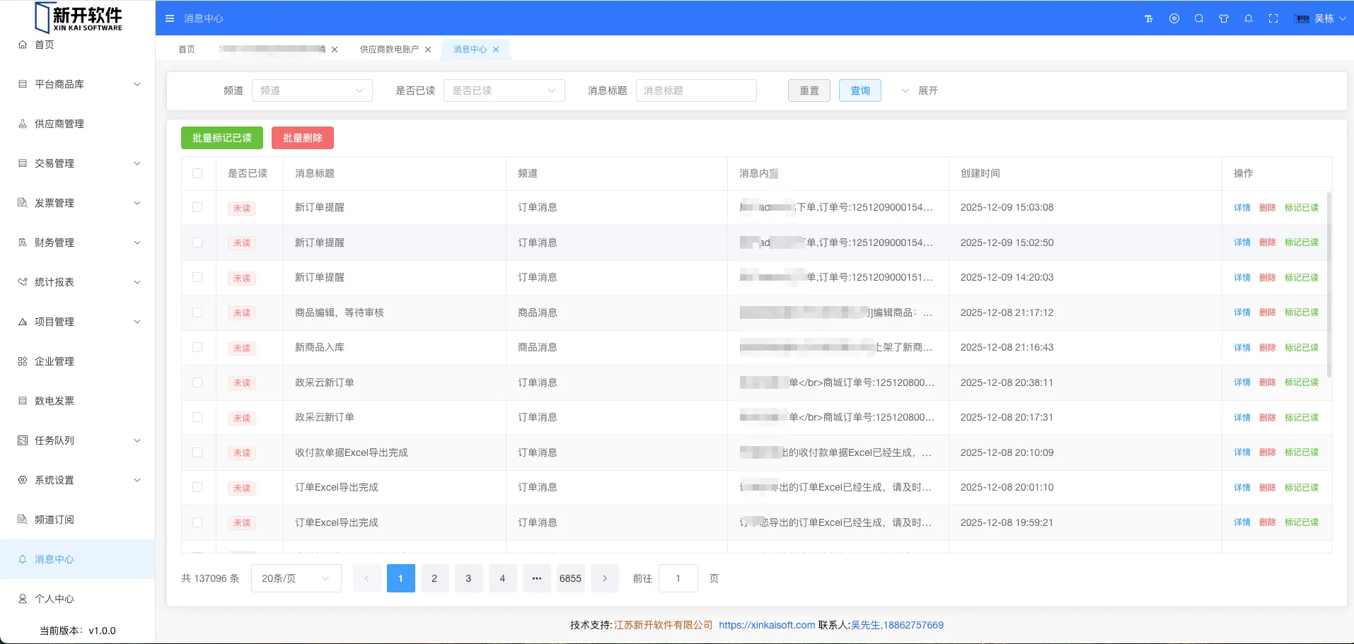 选择需要标记的消息,点击批量标记已读按钮。