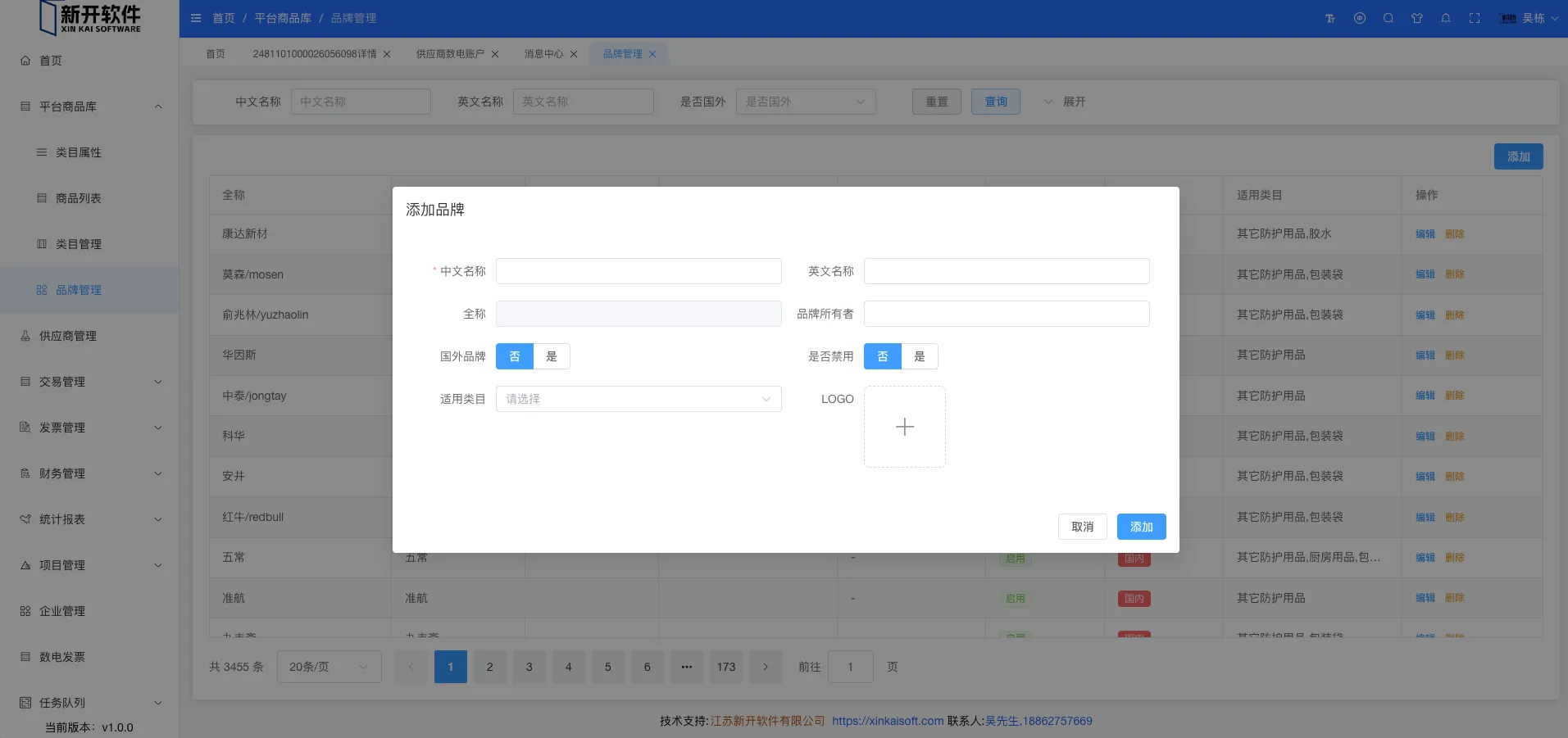 管理商品的品牌信息,包括品牌名称、适用类目等信息。