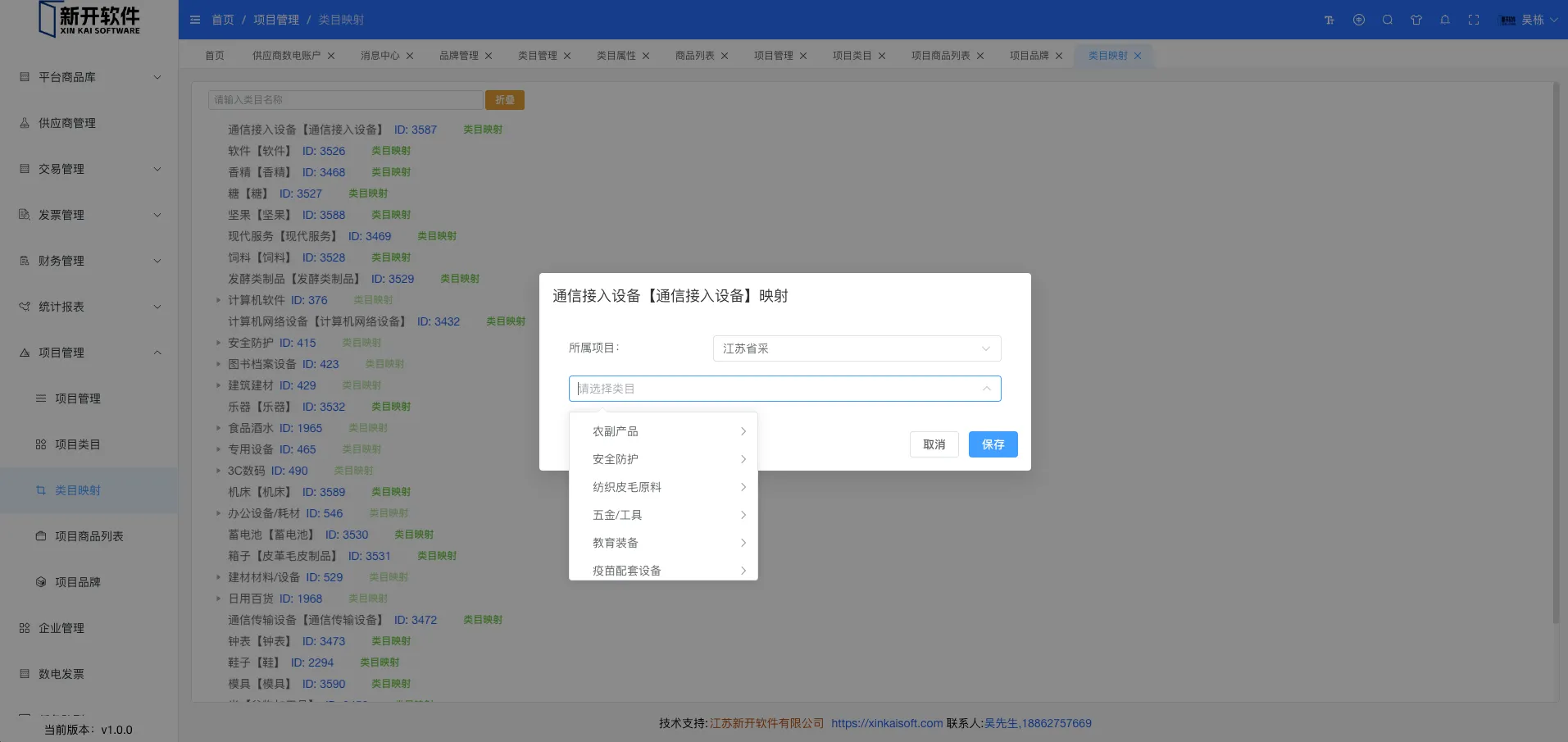 类目映射:选择项目和项目类目,形成项目类目的映射关系。