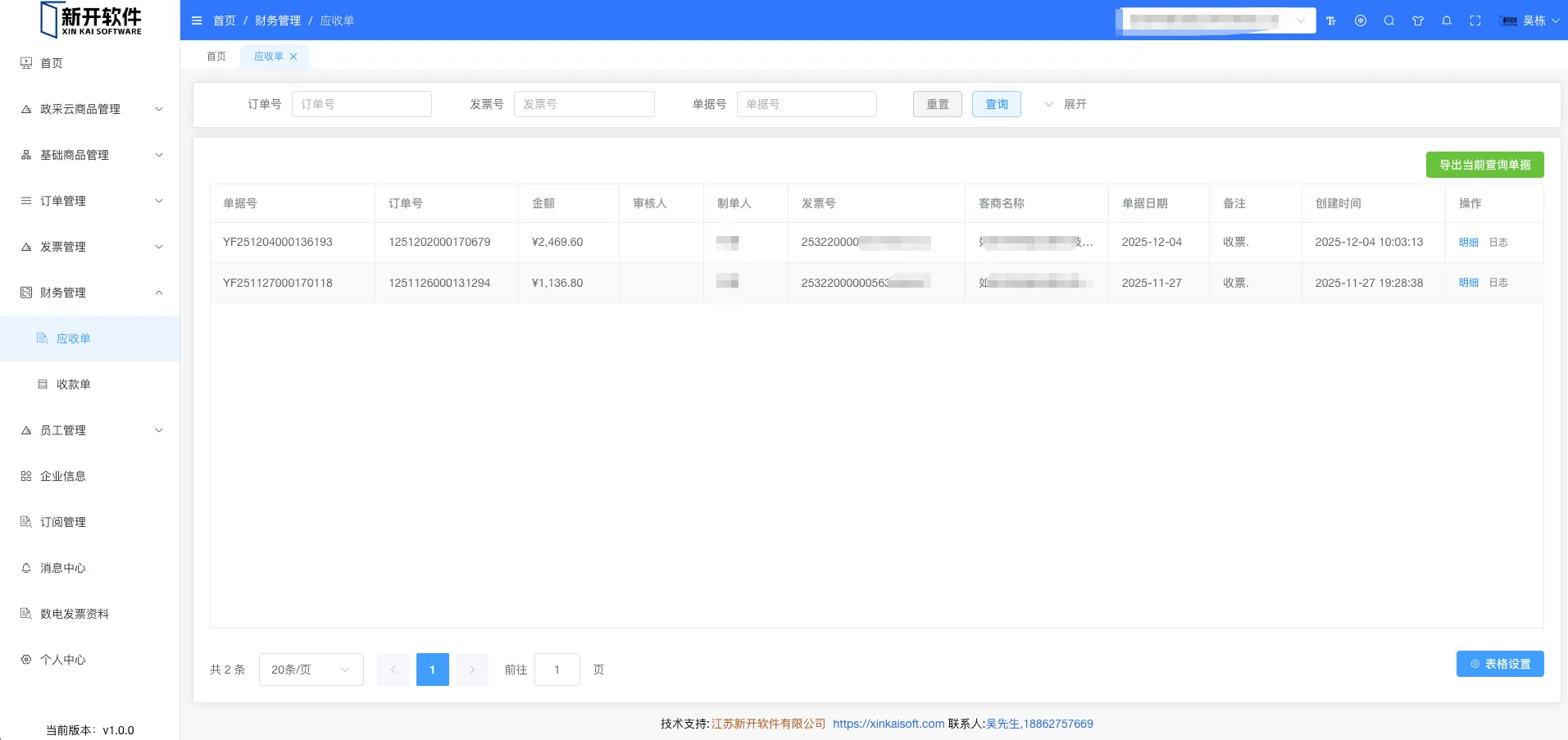 展示所有应收单信息。