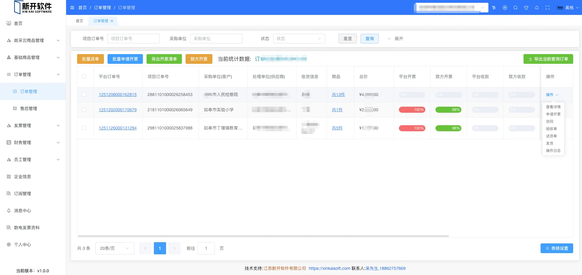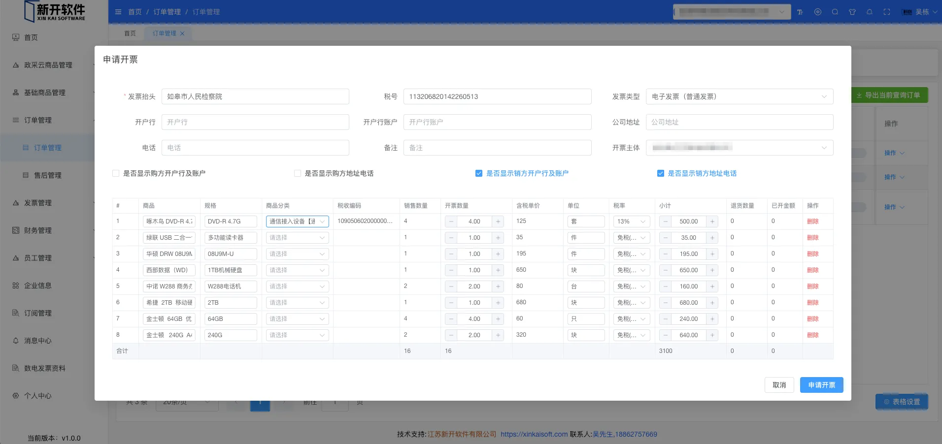Section titled “批量申请开票”- 批量选择订单,进行申请开票操作。